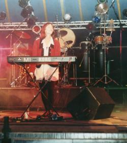 Jo with her first Iona keyboard - a Korg M1 - Greenbelt Festival 1991 - photo by Paul Heffer